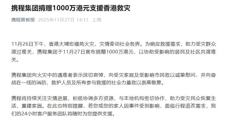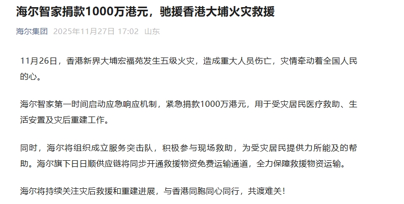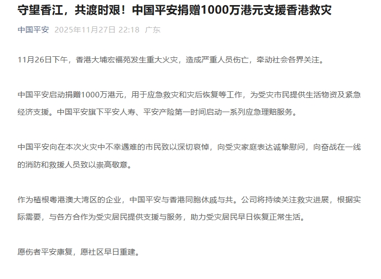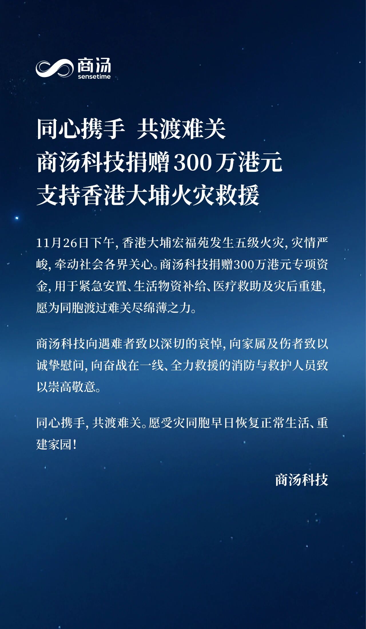 【商湯科技捐贈300萬港元支持香港大埔火災救援】“商湯科技SenseTime”微信號消息,商湯科技捐贈300萬港元,支持香港大埔火災救援。(中新經緯APP)